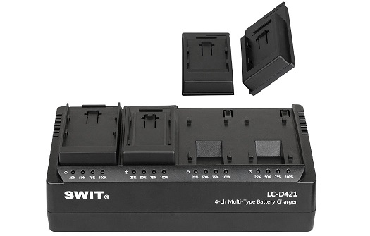 LC-D421B может одновременно заряжать 4 аккумулятора Panasonic VW-VBG6 или SWIT S-8BG6 с напряжением заряда 8,4В и током заряда 2А для каждого канала. В зарядном устройстве используются сменные аккумуляторные площадки KA-C10B. При необходимости можно приобрести дополнительные аккумуляторные площадки для заряда аккумуляторов других производителей: