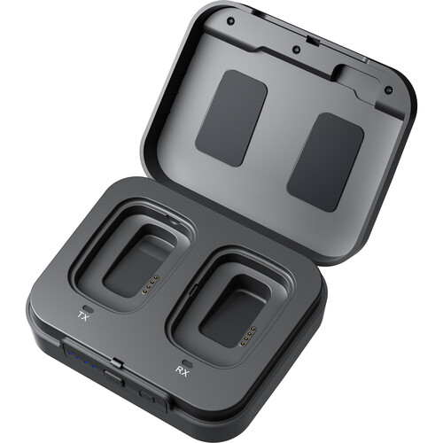Передатчик и радиосистема хранятся в специальном зарядном кейсе, что гарантирует безопасное хранение и транспортировку. Для пополнения аккумулятора достаточно лишь положить гаджет в свой слот и энергозапас начнет пополняться. Подзарядить сам кейс можно при помощи сетевого адаптера или даже внешнего аккумулятора, а встроенной батареи радиосистемы хватит на 8 часов автономно работы