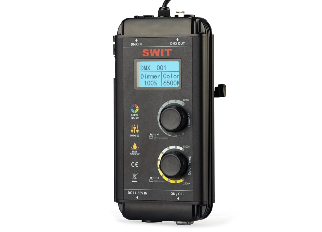 На экране блока управления отображается уровень светового потока в процентах, цветовая температура и DMX адрес. Управление DMX поддерживает режим консоли и интерактивное управление без консоли. Удерживание нажатия ручки цветовой температуры позволяет переключаться между режимом консоли и интерактивным режимом управления, а длительное нажатие кнопки диммера используется для установки DMX адреса.