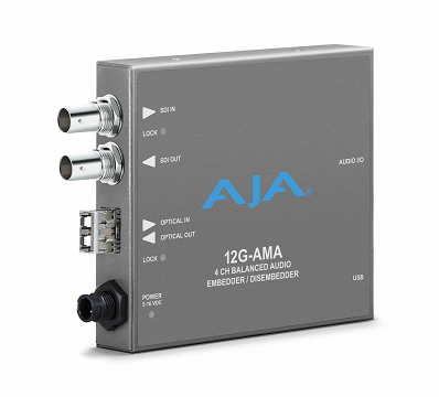 AJA 12G-AMA — четырехканальный эмбеддер/дээмбеддер аналогового звука с входом и выходом 12G-SDI в формате до 4K / UltraHD с оптическим LC приёмопередатчиком. С помощью этого мини-ковертера вы сможете извлекать четырехканальный аналоговый звук из входного 12G-SDI-сигнала, а также наоборот — интегрировать во входной сигнал аналоговый звук из внешнего источника.