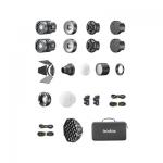 Комплект из двух светодиодных осветителей Godox RS60Bi, дополнительно включающий адаптеры для питания от сети, набор магнитных светоформирующих насадок, фокусирующую оптическую насадку, складной диффузор и софтбокс, размещенные в общем кейсе.