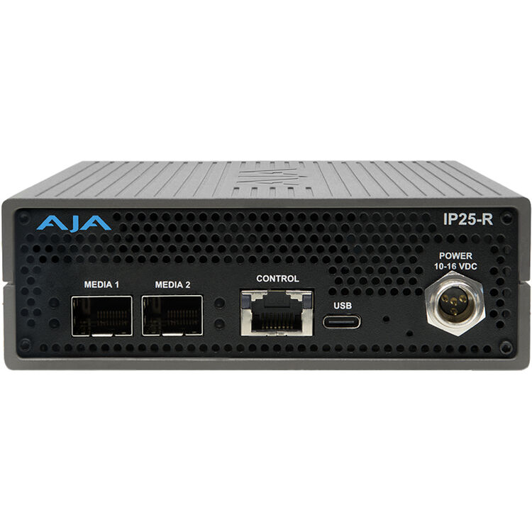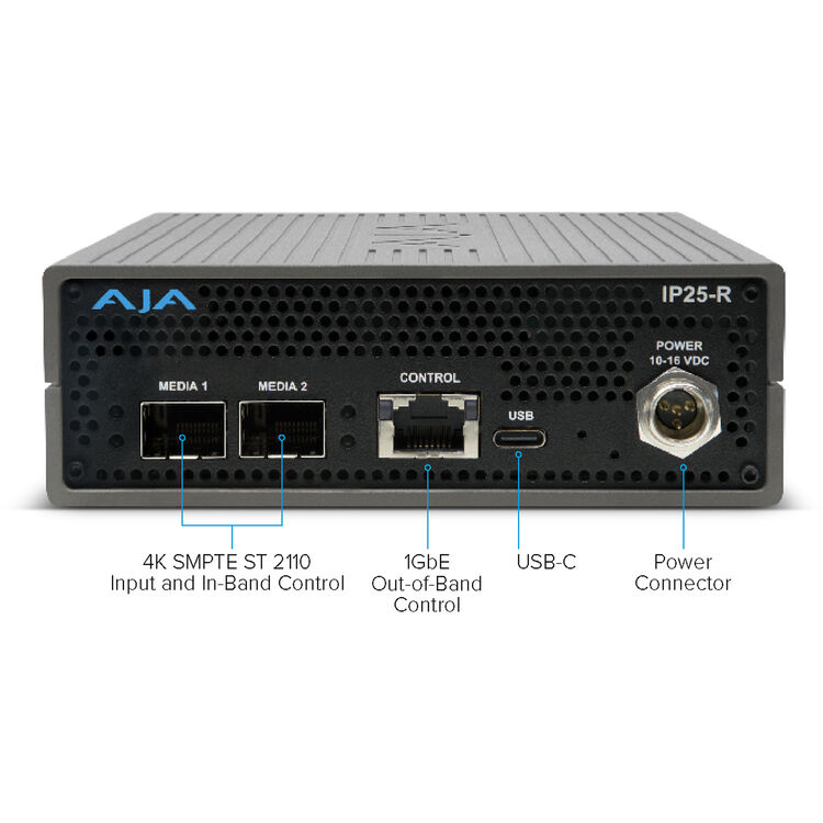 IP25-R, разработанный для профессиональных вещательных, производственных и live-сред, оснащен двумя сетевыми портами 10/25 GigE, четырьмя выходами 12G-SDI BNC и двумя выходами HDMI 2.0, обеспечивая преобразование видео до 4K DCI (4096×2160p60) со сверхнизкой задержкой.
