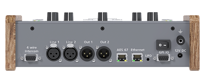 Устройство имеет 2 независимых трансформаторных выхода, 2 входа для подключения программ, 1 канал 4 проводной служебной связи и модуль AES67 на 4 входных и 4 выходных линии.