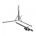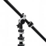 Телескопическая съемная перекладина, состоящая из трех секций, регулируется по длине от 500 до 1300 мм. На стойку штанга устанавливается с помощью поворотной втулки с гнездом 5/8”, которая фиксируется винтовым зажимом. Механизм кронштейна с храповиком позволяет точно настроить угол наклона стрелы и предотвратить ее случайное смещение во время съемки.