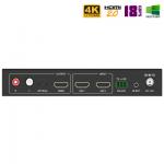 С HDMI переключателем Dr.HD SW 217 SM пользователь может управлять каждым входом и создавать комбинации из двух входов на одном дисплее. Имеется 4 режима отображения, в пределах диапазона режимов пользователь может свободно переключать источники сигнала. Переключатель поддерживает полный диапазон разрешений вплоть до 4K @60Hz, а для подключения внешних систем распределения звука есть опция деэмбеддинга. Управление устройством осуществляется с помощью кнопок на передней панели, ИК-пульта, навигации по экранному меню, фирменного ПО, а также команд RS-232.