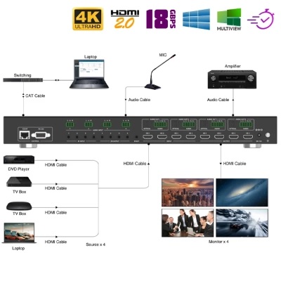 - Раздавать аудио- видео- контент в разрешении 4K от 4 источников на 4 экрана (HDMI матрица)