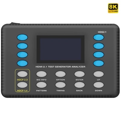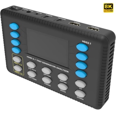 - Генерирует тестовые сигналы HDMI 2.1 с разрешением до 8K (7680x4320 пикселей) и частотой до 60 Гц