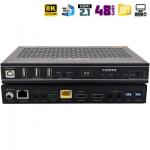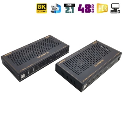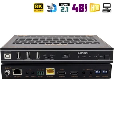 HDMI удлинитель по витой Dr.HD EX 90 HBT 8K предназначен для передачи несжатого видео- и аудио- сигнала ультра высокой четкости (Ultra HD), управления по RS-232 и ИК, а также 1GbE Ethernet, на расстояние до 90 м по одному кабелю витая пара CAT 6A/7. Разрешение видео до 8K 30 4:4:4 10bit, 4K 120Hz 4:4:4 10bit. Поддерживается передача eARC/ARC с HDMI-выхода RX на HDMI-вход TX или деэмбеддинг звука на выходной порт HDMI TX. Кроме того, он поддерживает передачу сигнала USB 2.0 (Host/Device настраивается) и двунаправленную функцию POC.