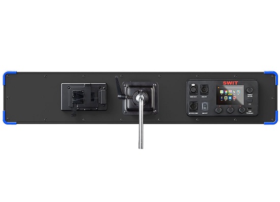 Задняя панель управления VANGO-100L поддерживает 5-контактный разъем DMX in & out, 4-контактный разъем XLR DC 11-36 В, V-образное крепление аккумуляторной батареи (опция - золотое крепление), а также большой цветной ЖК-дисплей с меню и горячими клавишами для удобного выбора цвета. Порт USB-A предназначен для обновления встроенного ПО или загрузки цветового профиля пользователя, а также для питания беспроводного DMX-приемника.