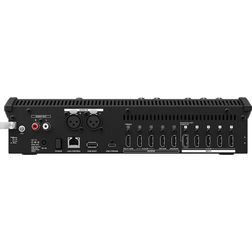 Пять одновременных HDMI-выходов V-1-4K обеспечивают высокую гибкость. Выходы 1 и 2 имеют фиксированное разрешение 4K для PGM и PVW, а разрешения выходов 3 и 4 можно понизить до HD. Это позволяет легко использовать комбинацию дисплеев с разрешением 4K и HD, что часто бывает необходимо на объектах, находящихся в процессе модернизации.