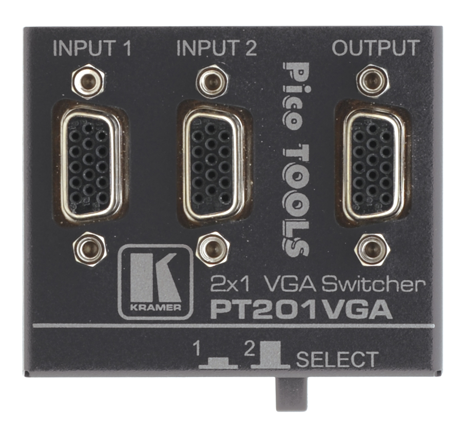 Kramer PT-201VGA — высококачественный коммутатор 2x1, обладающий маленькими размерами. Коммутаторпредназначен для работы с сигналами VGA/XGA/UXGA через 15контактные разъемы HD. Коммутатор имеет два входа. Пользователь имеет возможность выбрать вход с помощью переключателя на передней панели. Для обеспечения очень широкой полосы пропускания и минимальной перекрестной помехи в коммутаторе используются высококачественные коммутирующие элементы и тщательно проработанная конструкция схемы. В PT-201VGA используется конструкция печатной платы с полосковыми линиями, что позволяет получить полосу пропусканиясигнала, превышающую 1200 МГц (1,2 ГГц!). Пассивная конструкция PT-201VGA избавляет от необходимости использовать источник питания. Коммутатор имеет возможность работать в «обратном» включении для коммутацииодного входа и двух дисплеев. Заметьте, что устройство не может передавать сигнал на два порта одновременно. PT-201VGA относится к новому семейству Kramer Pico TOOLS — изделий для решения задач, требующих бескомпромиссного качества и компактных размеров по приемлемой цене.