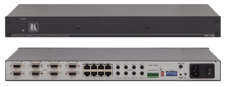 TP-185 - передатчик компьютерного графического видеосигнала совместно с небалансным стереофоническим аудиосигналом и двунаправленными сигналами интерфейса RS-232/RS-485. У прибора восемь каналов. Входной сигнал каждого канала преобразуется в формат для передачи по кабелю на витой паре и передается в соответствующие приемники. TP-185 прекрасно дополнит любой матричный коммутатор с восемью выходами, давая возможность передавать его выходные сигналы по кабелям на витой паре.