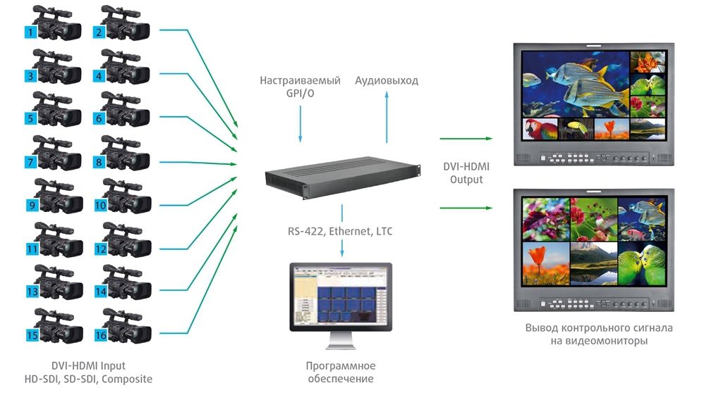 - 12 входных HD-SDI/SD-SDI/Composite видеосигналов с автоопределением,