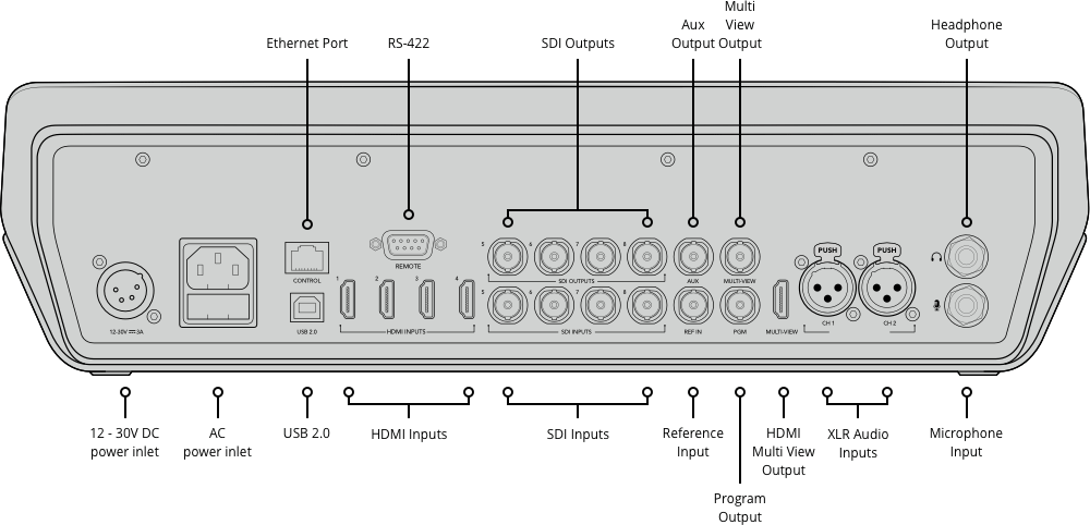 Обе HD-модели оснащаются разъемами 3G‑SDI, которые автоматически используют нужную скорость передачи данных для форматов SD-SDI, HD-SDI и 3G‑SDI, а ATEM Television Studio Pro 4K имеет интерфейс 12G‑SDI с поддержкой HD-SDI и Ultra HD. Это позволяет выбрать видеомикшер для подключения к любой профессиональной камере или деке при работе с материалом в NTSC/PAL до 720p, 1080i, 1080p и 2160p. Более подробная информация о технических спецификациях содержится в разделе «Характеристики».